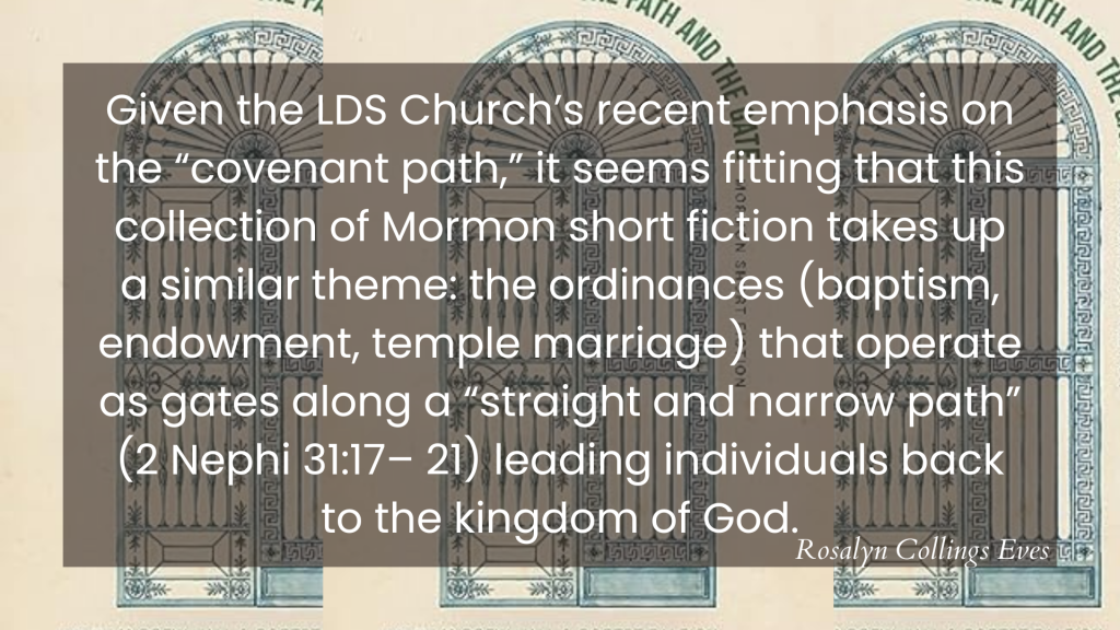 Given the LDS Church’s recent emphasis on the “covenant path,” it seems fitting that this collection of Mormon short fiction takes up a similar theme: the ordinances (baptism, endowment, temple marriage) that operate as gates along a “straight and narrow path” (2 Nephi 31:17–21) leading individuals back to the kingdom of God.