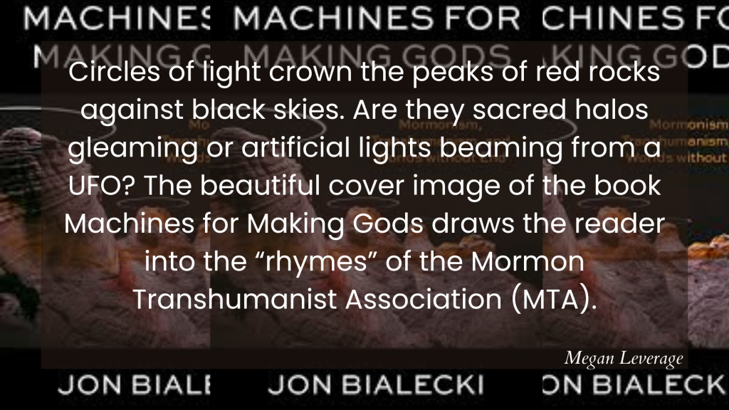 Circles of light crown the peaks of red rocks against black skies. Are they sacred halos gleaming or artificial lights beaming from a UFO? The beautiful cover image of the book Machines for Making Gods draws the reader into the “rhymes” of the Mormon Transhumanist Association (MTA). Despite the anti-scientific attitudes of conservative forms of Christianity, including and especially Mormonism, anthropologist of Christianity Jon Bialecki explores the complex relationship between religion and science, through the “foldings, inversions, and twists” of Mormonism and transhumanism (49). For those unfamiliar with the term, Bialecki defines transhumanism as “the positive anticipation of the possibility that increases in technology will allow Homo sapien sapiens to overcome their historic species’ limits to such as degree that they become something else altogether” (76).