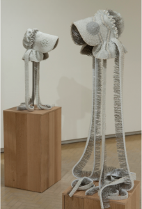 nine bonnets, corsage pins, fabric, steel, and white oak, dimensions variable